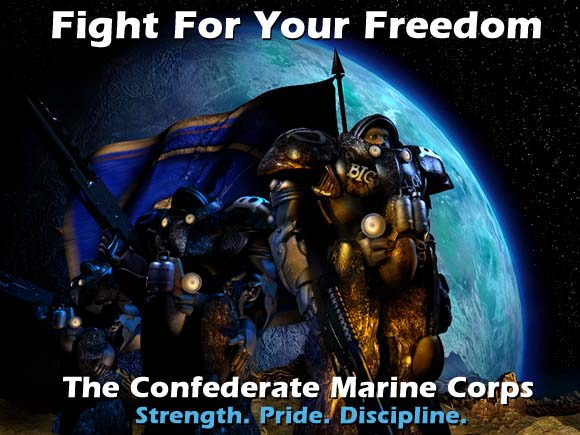 By the time of the protoss attack on Chau Sara, each Confederate marine was officially issued a CMC-300/CMC-400 combat suit and a C-14 rifle. The slugthrower was a common sidearm.[7] Confederate marines did not require a PEB (Preferred Experience Base) to enlist (or be conscripted as the case often was).[9]